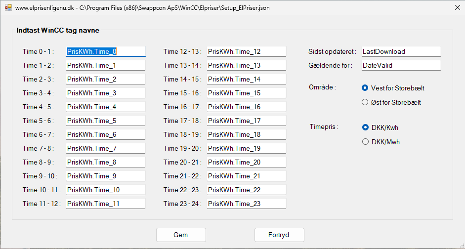 - Oprette 24 WinCC tags til lagring af Kwh/Mwh timepriser.