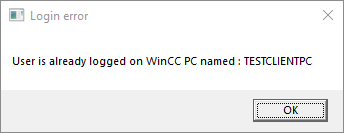 Når én operatør er logget ind med bruger credentials, der giver betjeningsret til det specifikke procesområde, vil der blive blokeret for yderligere brug af samme credentials i WinCC. Forsøger en anden operatør, via en anden klient PC, at logge ind med samme credentials for at få betjeningsretten til området, vil indlogningen bliver blokeret, og der bliver vist en informationstekst i en dialogboks. Teksten indeholder information om hvilken PC i netværket der pt har betjeningsretten: